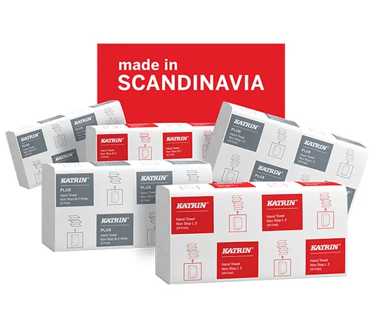 Katrins lokalt produserte serie med papirhåndklær, Made in Scandinavia, produseres ved Metsä Tissues fabrikk i Mariestad i Sverige – nær deg, med kortere transportveier og produksjon ved en moderne fabrikk med fokus på miljø og ressurseffektivitet.4